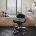 On the CoreChair, the pelvis is embraced and rendered in a neutral posture. This alleviates the need to over-engage your core. This pivot point on a CoreChair is directly beneath your center of balance. So with your pelvis and your thighs supported, and your feet stable on the ground, we have a very stable three-point base of support. Another misconception is that we might get tired from moving.
