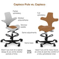 + The Capisco Puls features a molded polyurethane seat and back, and a slimmer saddle that allows you to sit with your legs closer together than the Capisco