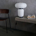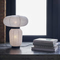 Here Hayon has dispensed with cultural formalities to create a series of lamps all in white. Handcrafted with rice paper merging various sizes and shapes together. The series is comprised of three different lantern versions and a table lamp in ivory white rice paper with black stained oak accents.