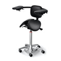 The Salli Expert Multiadjuster Saddle chair is an excellent option if you feel the need for support for both your left and right arms at the same time as you work on precision work. The tilt mechanism enables you to better position your body as you work on your task. The foot-operated height adjuster enables you to adjust the chair without using your busy / sanitized hands. The backrest enables you to strech when working long hours.